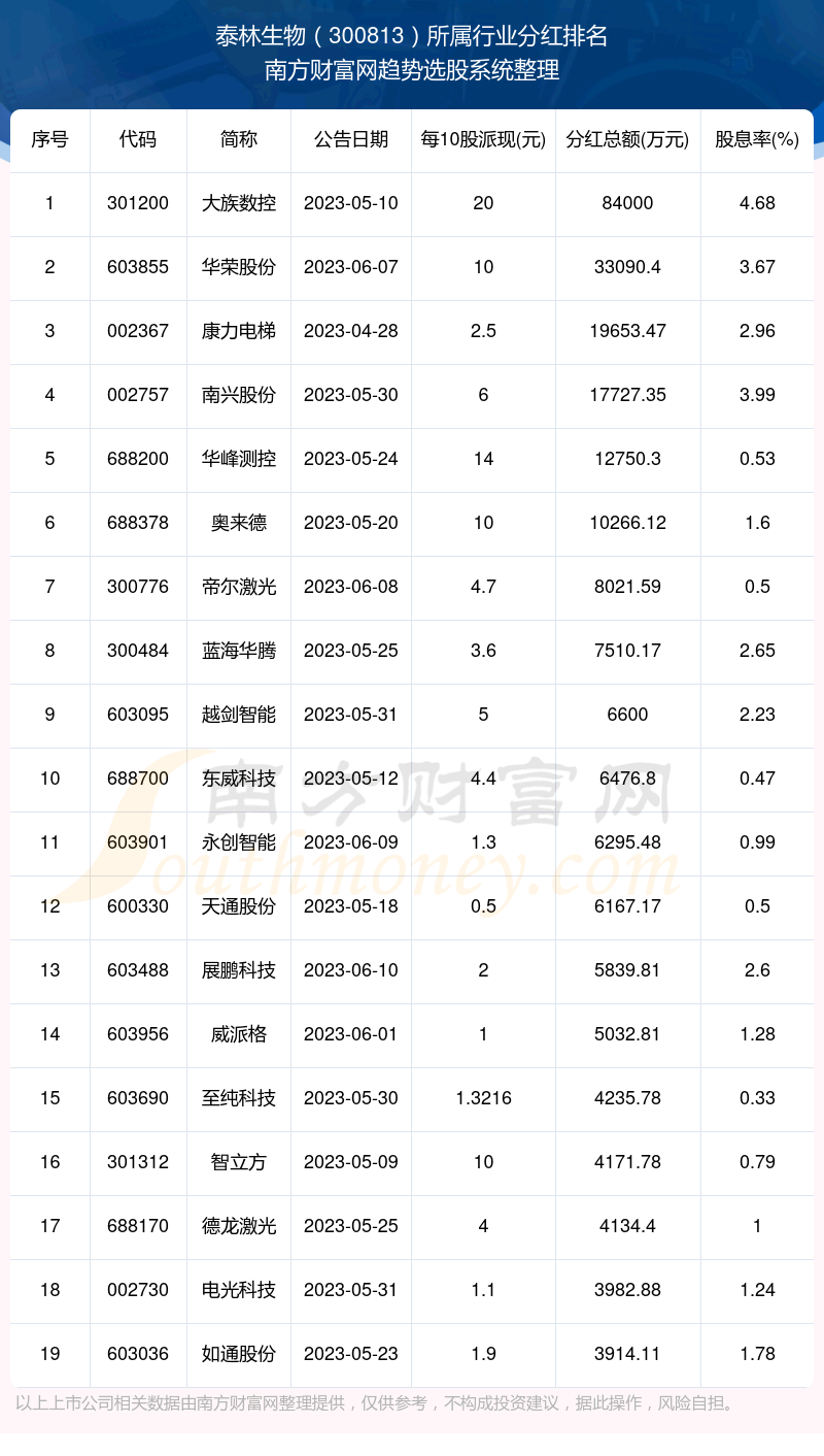 按照趋势选股系统统计,泰林生物所属行业为专用设备行业,专用设备行业分红排名情况如下表: