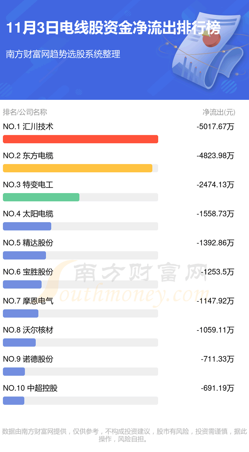 电线股11月3日资金净流出情况来看,汇川技术位列第一位,主力净流出达到-5017.67万元;东方电缆排名第二,主力净流出为-4823.98万元;特变电工排名第三,主力净流出-2474.13万元。主力净流出排名前10的还有:太阳电缆、精达股份、宝胜股份、摩恩电气、沃尔核材、诺德股份、中超控股。