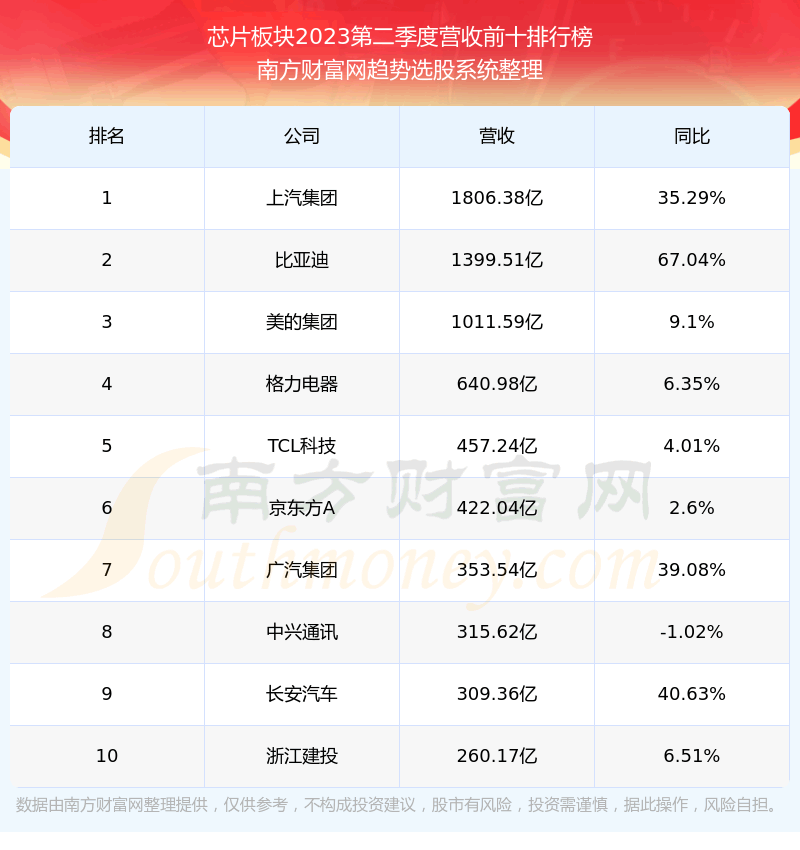 按照趋势选股系统统计,该股所属板块为芯片板块,该板块共有508只股票,安路科技2023第二季度营收在该板块中排名为第383名,该板块2023第二季度营收排名前十的股票如下表: