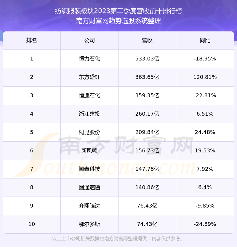 按照趋势选股系统统计,该股所属板块为纺织服装板块,该板块共有188只股票,牧高笛2023第二季度营收在该板块中排名为第94名,该板块2023第二季度营收排名前十的股票如下表:
