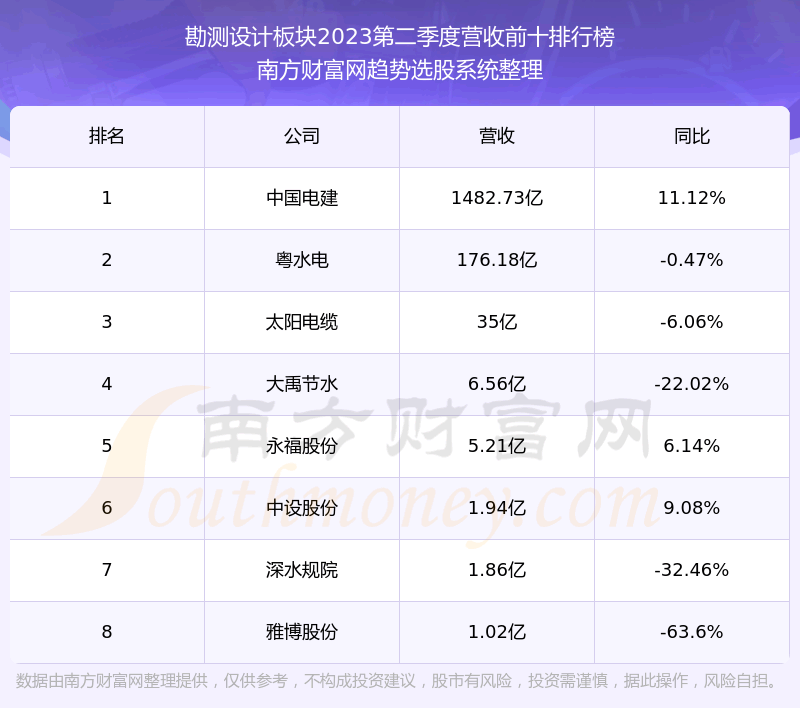 按照趋势选股系统统计,该股所属板块为勘测设计板块,该板块共有8只股票,中国能建2023第二季度营收在该板块中排名为第8名,该板块2023第二季度营收排名前十的股票如下表: