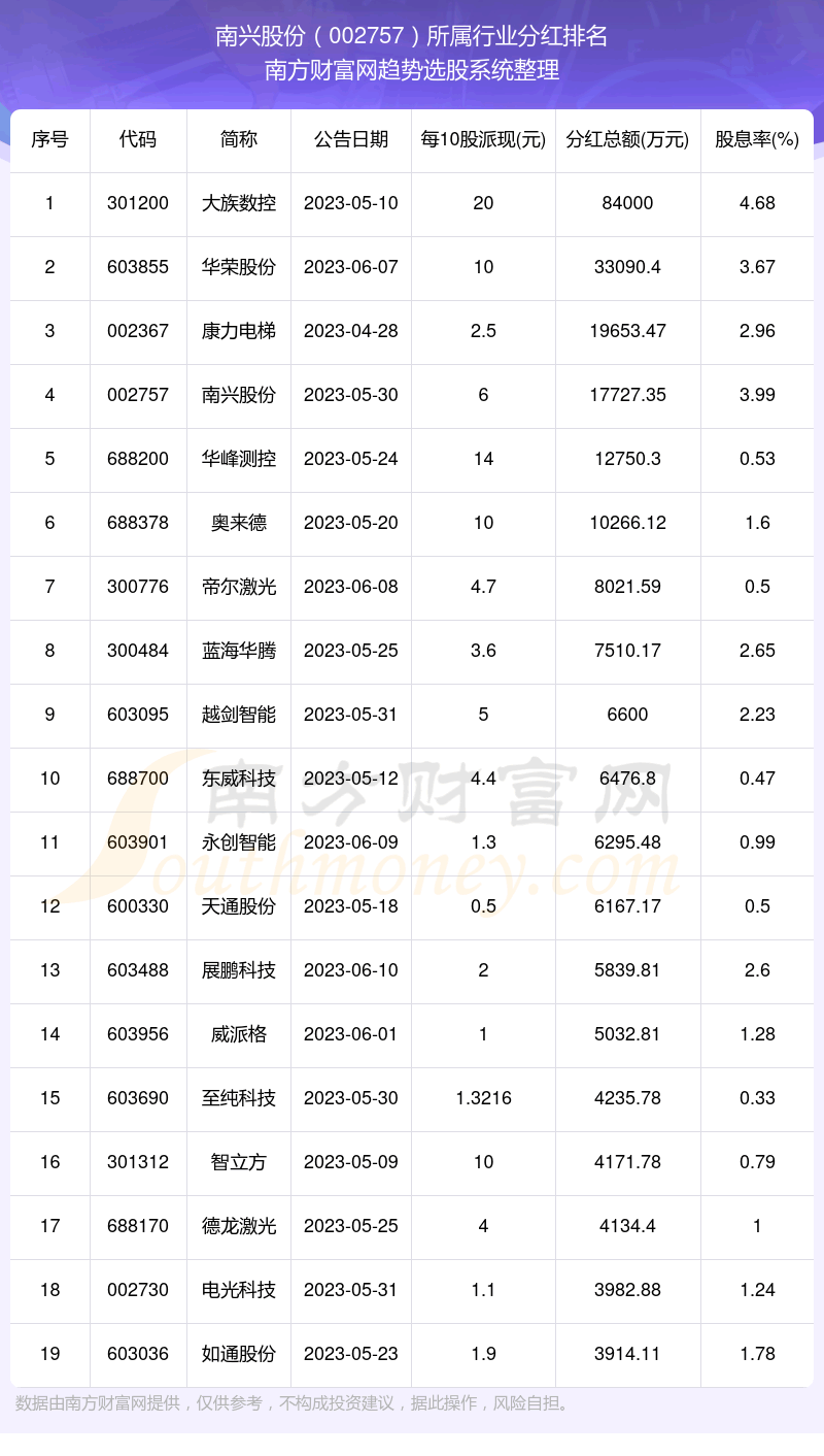 南兴股份002757历史分红情况所属行业股票分红排名 |