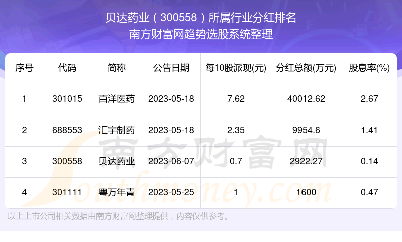 按照趋势选股系统统计,贝达药业所属行业为药品销售行业,药品销售行业分红排名情况如下表: