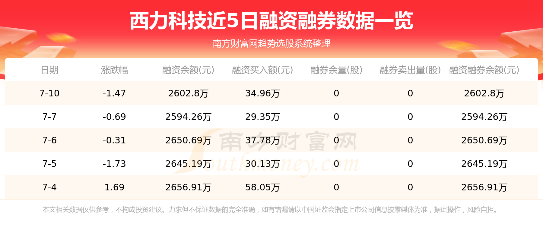 7月10日西力科技融券信息显示,融资方面,当日融资买入34.96万元,融资偿还26.42万元,融资净买额8.54万元。近5日融资融券数据一览见下表: