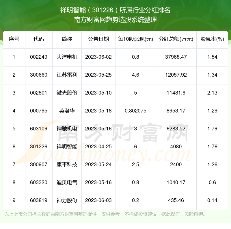 按照趋势选股系统统计,祥明智能所属行业为电机行业,电机行业分红排名情况如下表: