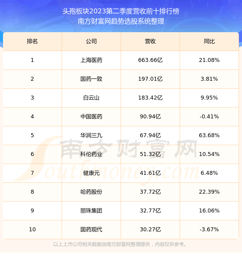 按照趋势选股系统统计,该股所属板块为头孢板块,该板块共有39只股票,莎普爱思2023第二季度营收在该板块中排名为第33名,该板块2023第二季度营收排名前十的股票如下表: