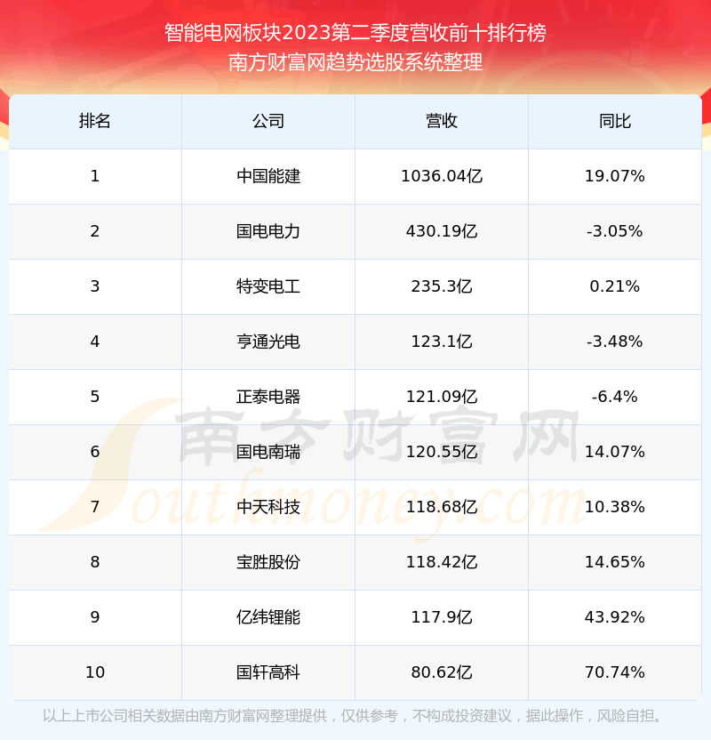 按照趋势选股系统统计,该股所属板块为智能电网板块,该板块共有245只股票,亿嘉和2023第二季度营收在该板块中排名为第207名,该板块2023第二季度营收排名前十的股票如下表:
