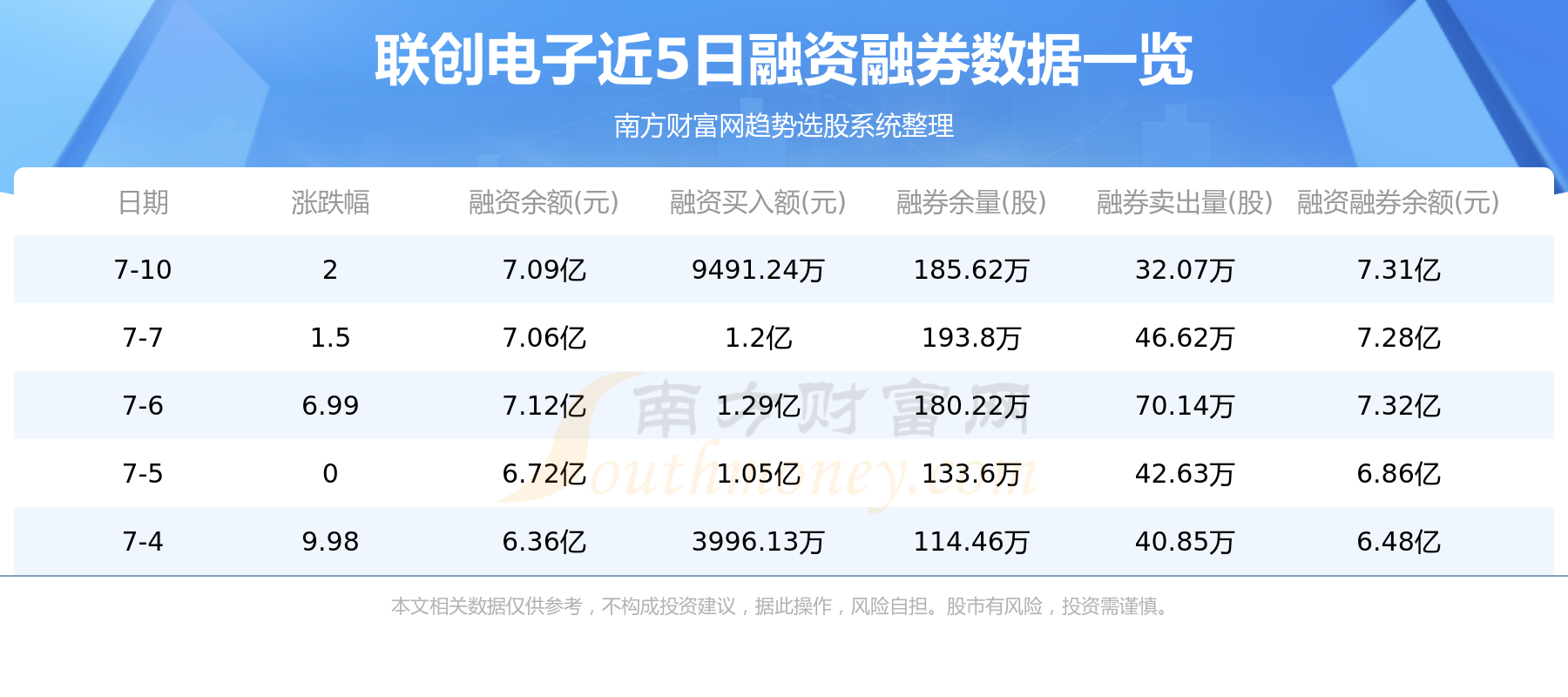 联创电子7月10日融券信息显示,融资方面,当日融资买入9491.24万元,融资偿还9161.88万元,融资净买额329.36万元。融券方面,融券卖出32.07万股,融券偿还40.25万股,融券余量185.62万股,融券余额2175.49万元。融资融券余额7.31亿元。近5日融资融券数据一览见下表: