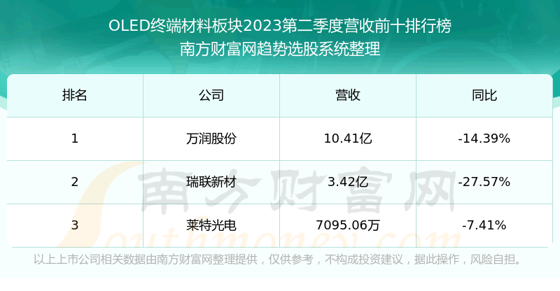 按照趋势选股系统统计,该股所属板块为OLED终端材料板块,该板块共有3只股票,莱特光电2023第二季度营收在该板块中排名为第3名,该板块2023第二季度营收排名前十的股票如下表: