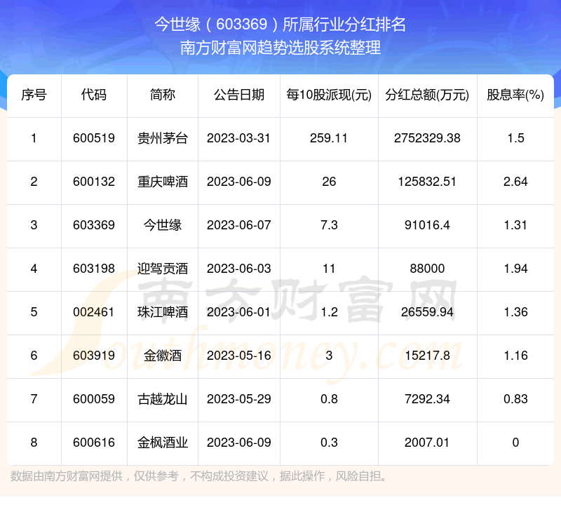按照趋势选股系统统计,今世缘所属行业为酿酒行业行业,酿酒行业行业分红排名情况如下表: