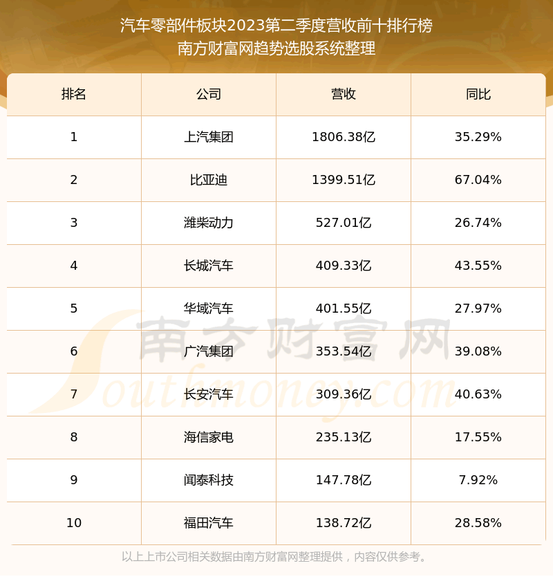 按照趋势选股系统统计,该股所属板块为汽车零部件板块,该板块共有434只股票,汉马科技2023第二季度营收在该板块中排名为第145名,该板块2023第二季度营收排名前十的股票如下表: