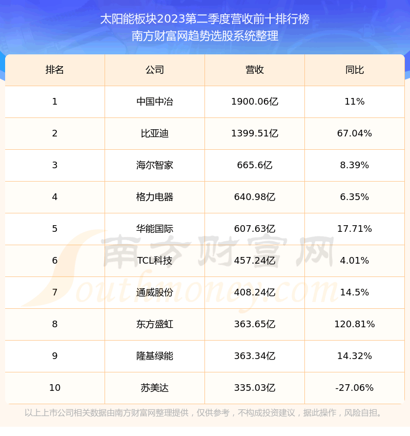 按照趋势选股系统统计,该股所属板块为太阳能板块,该板块共有388只股票,华荣股份2023第二季度营收在该板块中排名为第233名,该板块2023第二季度营收排名前十的股票如下表: