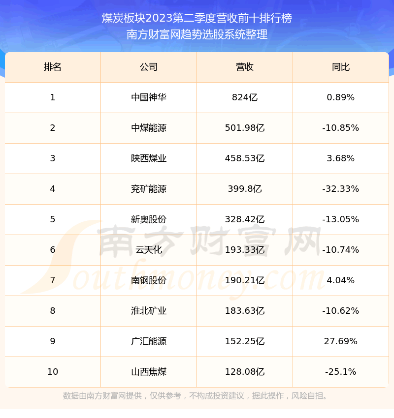 按照趋势选股系统统计,该股所属板块为煤炭板块,该板块共有61只股票,兖矿能源2023第二季度营收在该板块中排名为第4名,该板块2023第二季度营收排名前十的股票如下表: