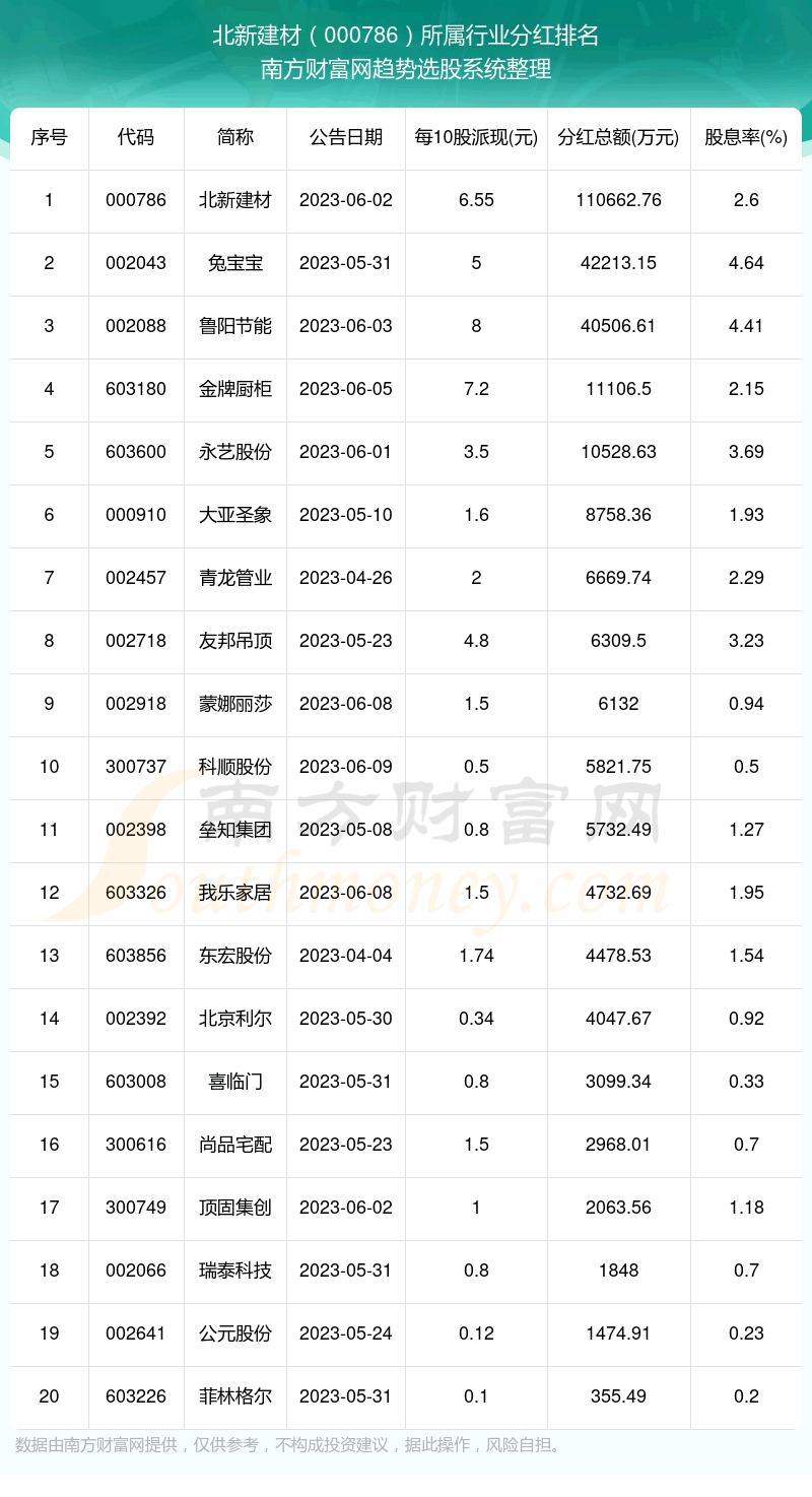 按照趋势选股系统统计,北新建材所属行业为石膏板行业,石膏板行业分红排名情况如下表: