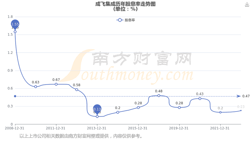 成飞集成最新一次公布的分红方案为10派0.5元。本次权益分派股权登记日为2023年5月30日,除权除息日为2023年5月31日,派息日为2023年5月31日。
