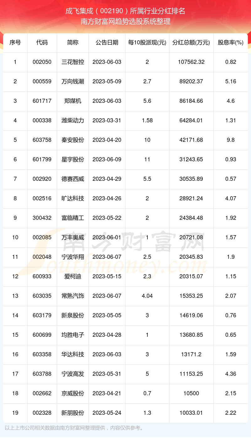 按照趋势选股系统统计,成飞集成所属行业为汽车零部件行业,汽车零部件行业分红排名情况如下表: