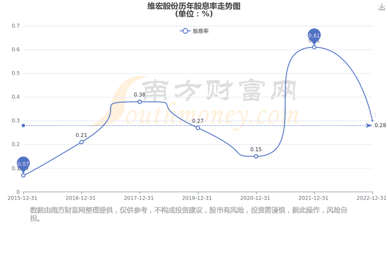 维宏股份最新一次公布的分红方案为10派0.88元。本次权益分派股权登记日为2023年5月22日,除权除息日为2023年5月23日,派息日为2023年5月23日。