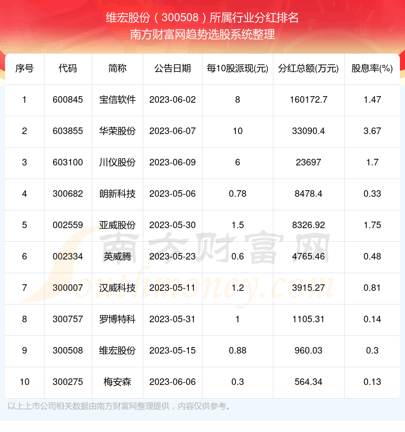 按照趋势选股系统统计,维宏股份所属行业为一体机行业,一体机行业分红排名情况如下表: