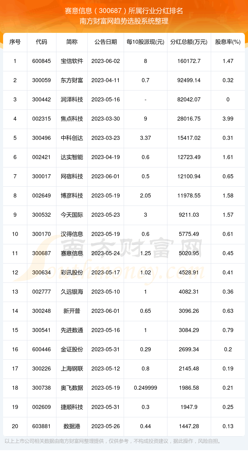 按照趋势选股系统统计,赛意信息所属行业为互联网服务行业,互联网服务行业分红排名情况如下表: