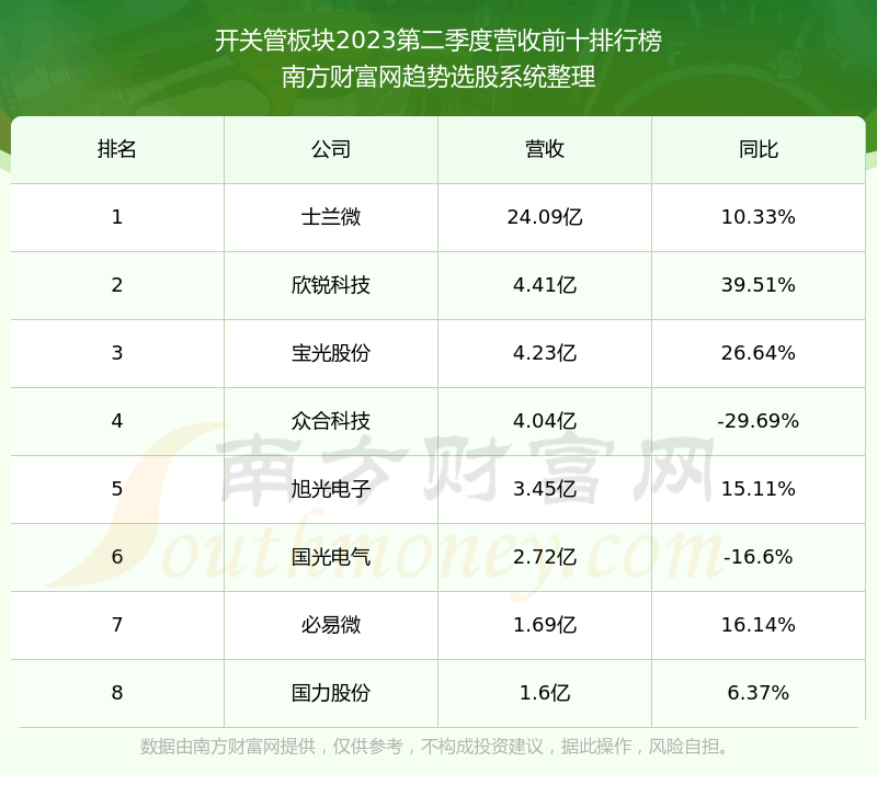 按照趋势选股系统统计,该股所属板块为开关管板块,该板块共有8只股票,旭光电子2023第二季度营收在该板块中排名为第5名,该板块2023第二季度营收排名前十的股票如下表: