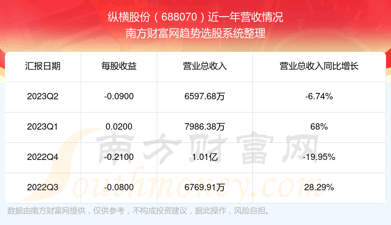 纵横股份披露了2023年第二季度财报。报告显示,纵横股份2023年第二季度实现营收6597.68万元,同比-6.74% ;归母净利润-718.08万元,同比-709.49% 。