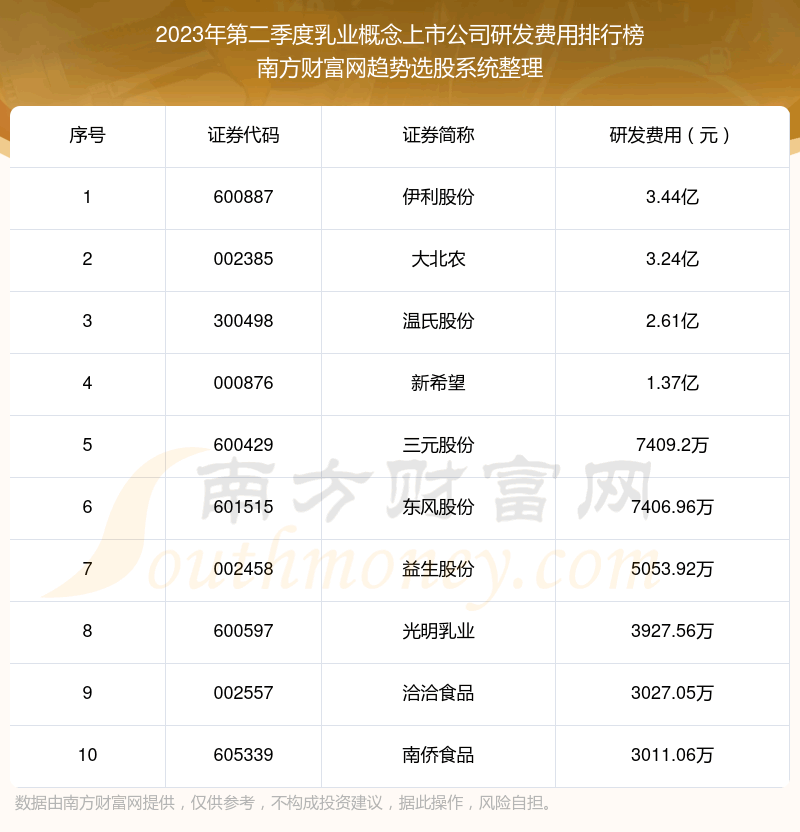 2023年第二季度,乳业概念上市公司研发费用排行榜中,伊利股份(600887)研发费用总额高达3.44亿,大北农(002385)和温氏股份(300498)排名第二和第三,新希望(000876)、三元股份(600429)、东风股份(601515)、益生股份(002458)、光明乳业(600597)、洽洽食品(002557)、南侨食品(605339)进入前十,研发费用总额分别排名第4-10名。