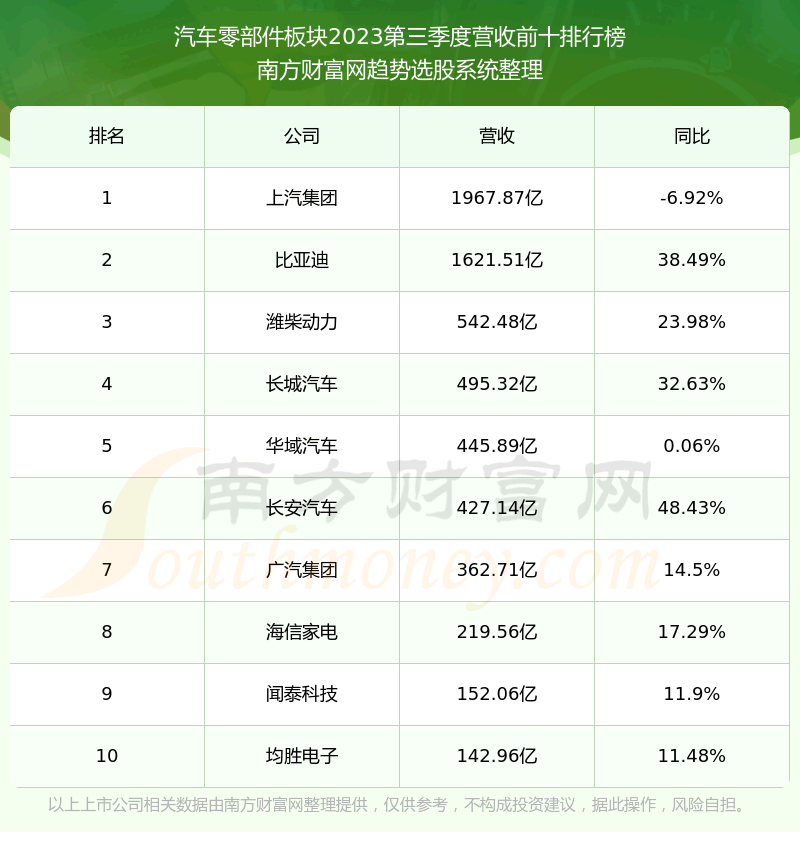 按照趋势选股系统统计,该股所属板块为汽车零部件板块,该板块共有440只股票,文灿股份2023第三季度营收在该板块中排名为第128名,该板块2023第三季度营收排名前十的股票如下表: