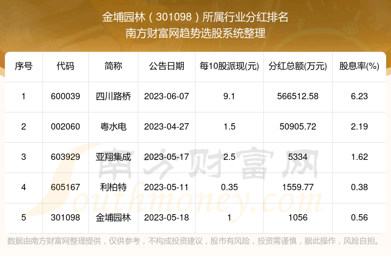 按照趋势选股系统统计,金埔园林所属行业为工程施工行业,工程施工行业分红排名情况如下表: