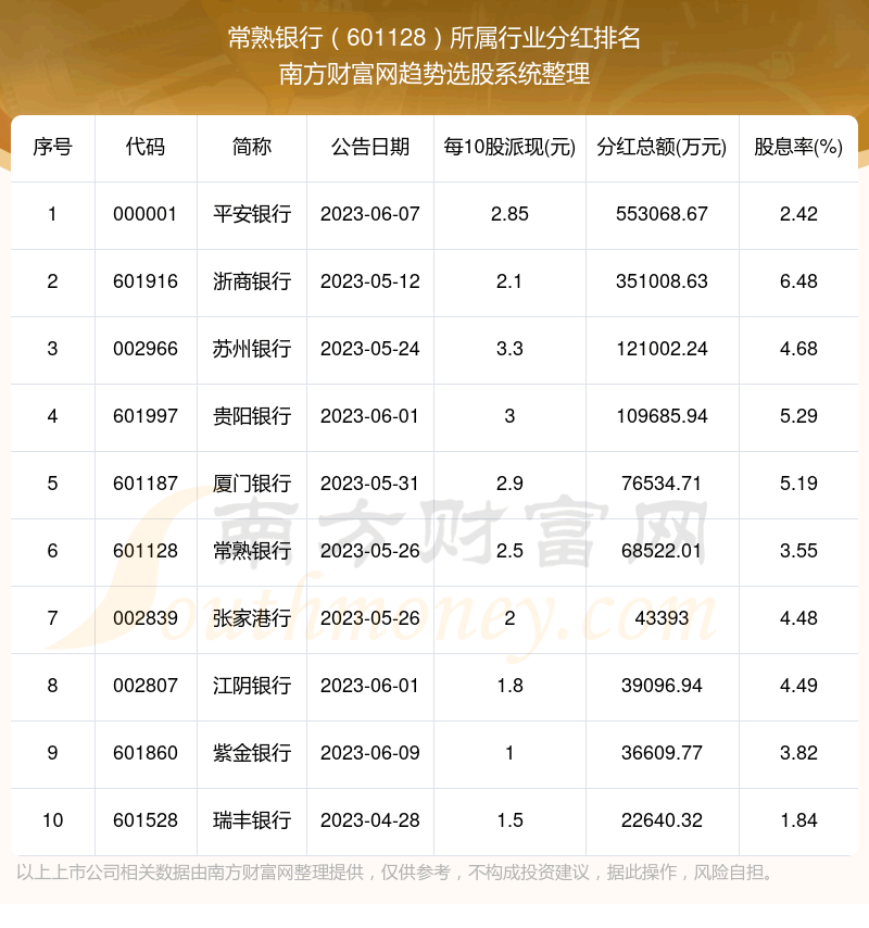 按照趋势选股系统统计,常熟银行所属行业为银行行业,银行行业分红排名情况如下表: