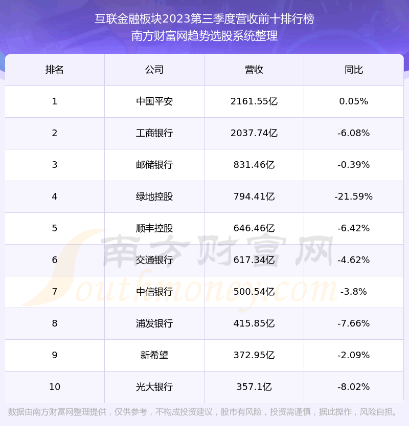 按照趋势选股系统统计,该股所属板块为互联金融板块,该板块共有238只股票,浦发银行2023第三季度营收在该板块中排名为第8名,该板块2023第三季度营收排名前十的股票如下表: