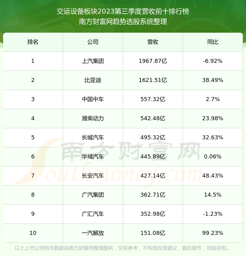 按照趋势选股系统统计,该股所属板块为交运设备板块,该板块共有286只股票,中国中车2023第三季度营收在该板块中排名为第3名,该板块2023第三季度营收排名前十的股票如下表:
