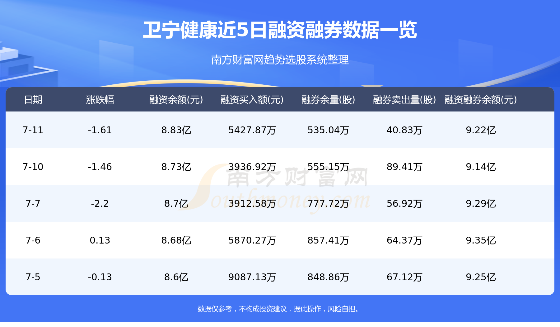 卫宁健康7月11日融券信息显示,融资方面,当日融资买入5427.87万元,融资偿还4394.3万元,融资净买额1033.57万元。融券方面,融券卖出40.83万股,融券偿还60.95万股,融券余量535.04万股,融券余额3921.81万元。融资融券余额9.22亿元。近5日融资融券数据一览见下表: