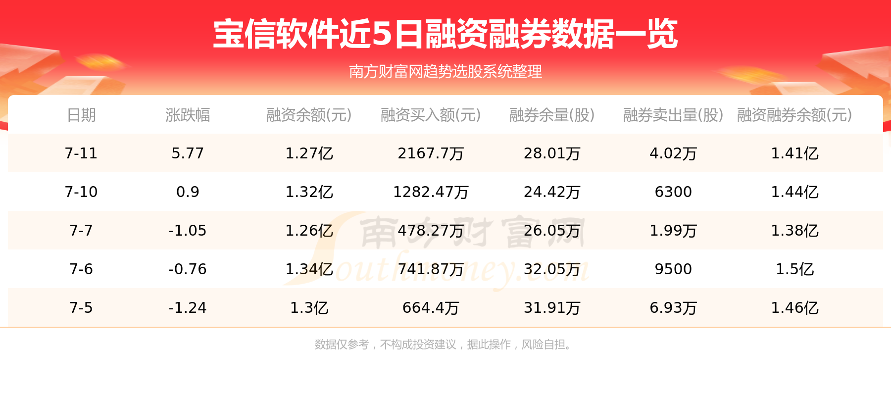 7月11日宝信软件融券信息显示,融资方面,当日融资买入2167.7万元,融资偿还2740.56万元,融资净买额-572.85万元。融券方面,融券卖出4.02万股,融券偿还4260股,融券余量28.01万股,融券余额1467.94万元。融资融券余额1.41亿元。近5日融资融券数据一览见下表: