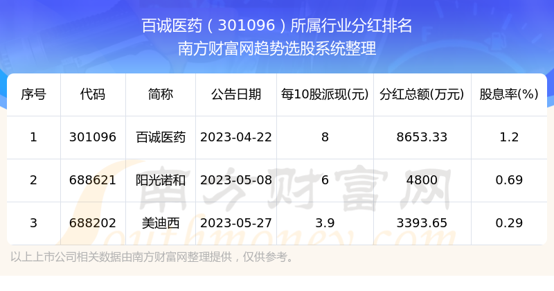 按照趋势选股系统统计,百诚医药所属行业为药学研究行业,药学研究行业分红排名情况如下表: