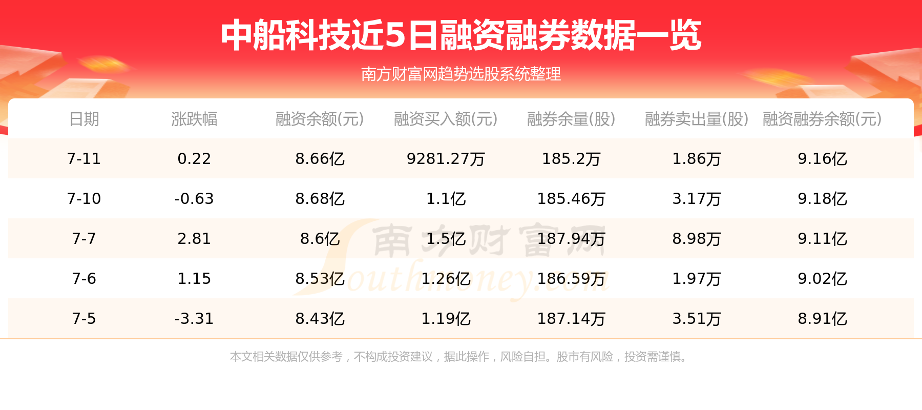 中船科技7月11日融券信息显示,融资方面,当日融资买入9281.27万元,融资偿还9456.42万元,融资净买额-175.14万元。融券方面,融券卖出1.86万股,融券偿还2.12万股,融券余量185.2万股,融券余额4993.11万元。融资融券余额9.16亿元。近5日融资融券数据一览见下表: