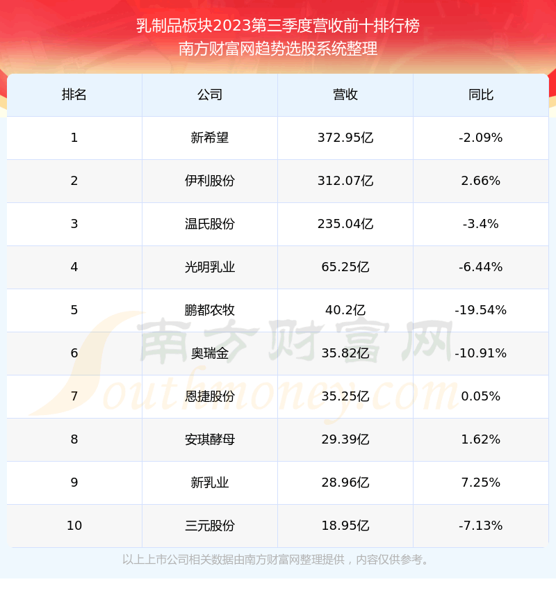按照趋势选股系统统计,该股所属板块为乳制品板块,该板块共有34只股票,天润乳业2023第三季度营收在该板块中排名为第15名,该板块2023第三季度营收排名前十的股票如下表:
