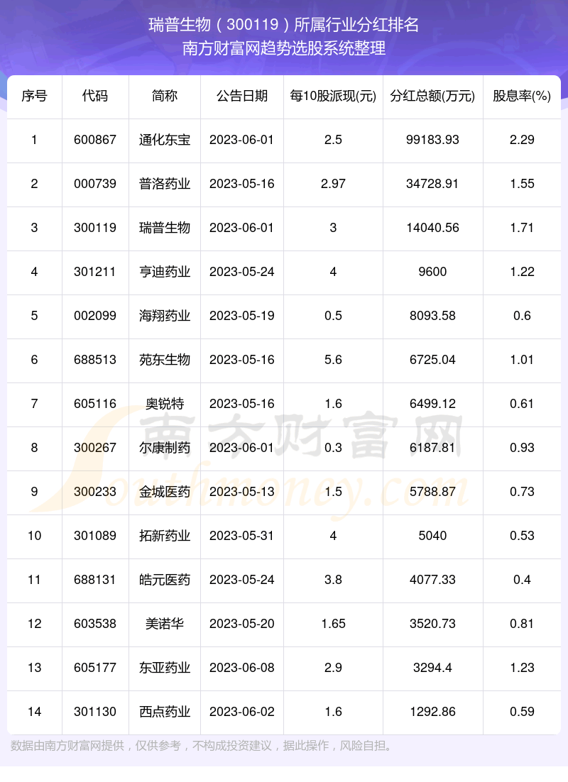 按照趋势选股系统统计,瑞普生物所属行业为原料药行业,原料药行业分红排名情况如下表: