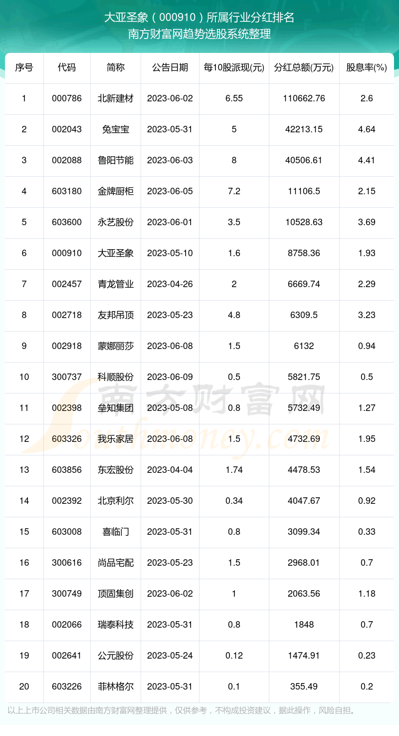 按照趋势选股系统统计,大亚圣象所属行业为木地板行业,木地板行业分红排名情况如下表: