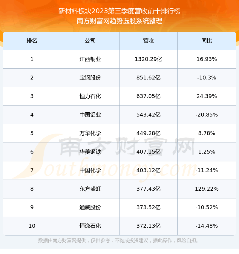 按照趋势选股系统统计,该股所属板块为新材料板块,该板块共有543只股票,五矿发展2023第三季度营收在该板块中排名为第17名,该板块2023第三季度营收排名前十的股票如下表:
