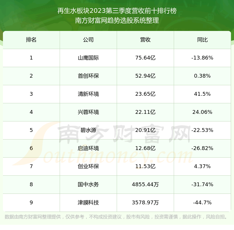 按照趋势选股系统统计,该股所属板块为再生水板块,该板块共有9只股票,创业环保2023第三季度营收在该板块中排名为第7名,该板块2023第三季度营收排名前十的股票如下表: