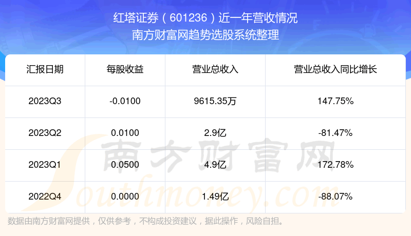按照趋势选股系统统计,该股所属板块为证券板块,该板块共有66只股票,红塔证券2023第三季度营收在该板块中排名为第65名,该板块2023第三季度营收排名前十的股票如下表: