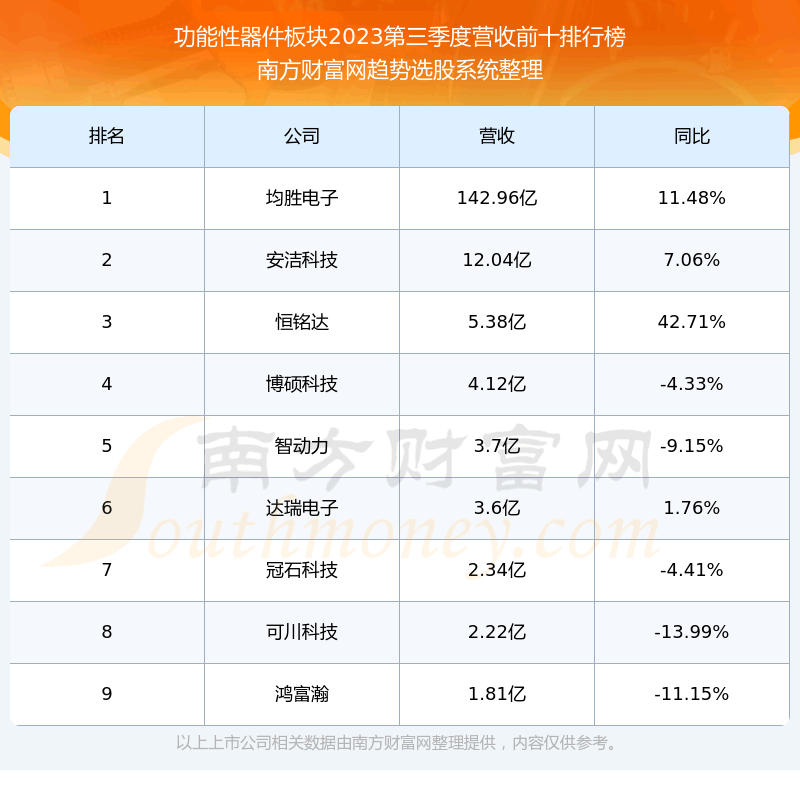 按照趋势选股系统统计,该股所属板块为功能性器件板块,该板块共有9只股票,可川科技2023第三季度营收在该板块中排名为第8名,该板块2023第三季度营收排名前十的股票如下表: