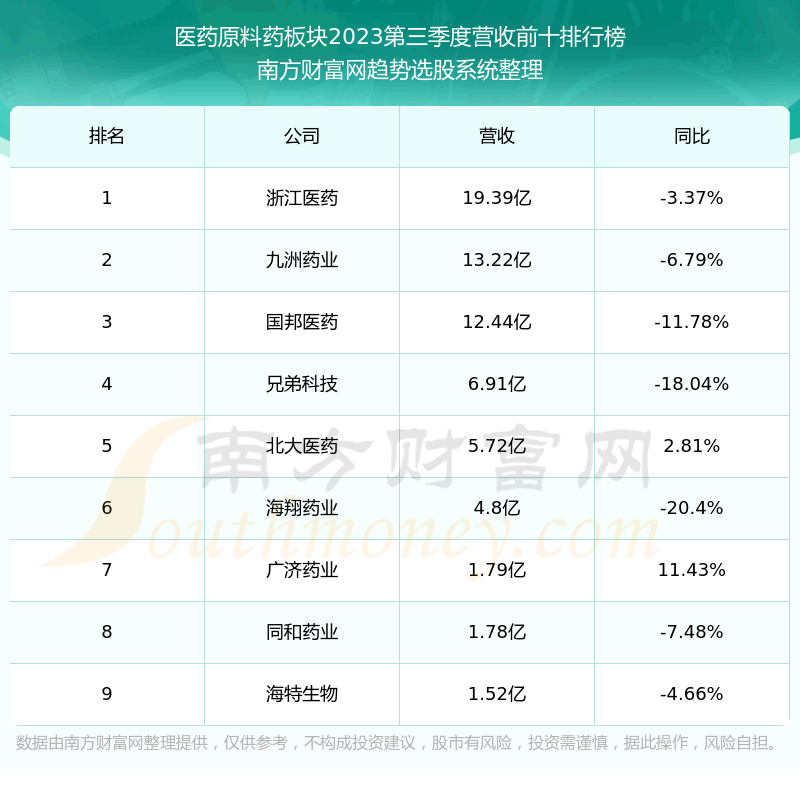 按照趋势选股系统统计,该股所属板块为医药原料药板块,该板块共有9只股票,国邦医药2023第三季度营收在该板块中排名为第3名,该板块2023第三季度营收排名前十的股票如下表: