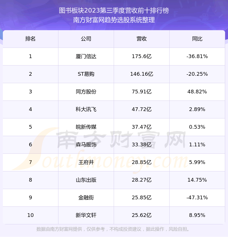 按照趋势选股系统统计,该股所属板块为图书板块,该板块共有64只股票,长江传媒2023第三季度营收在该板块中排名为第19名,该板块2023第三季度营收排名前十的股票如下表: