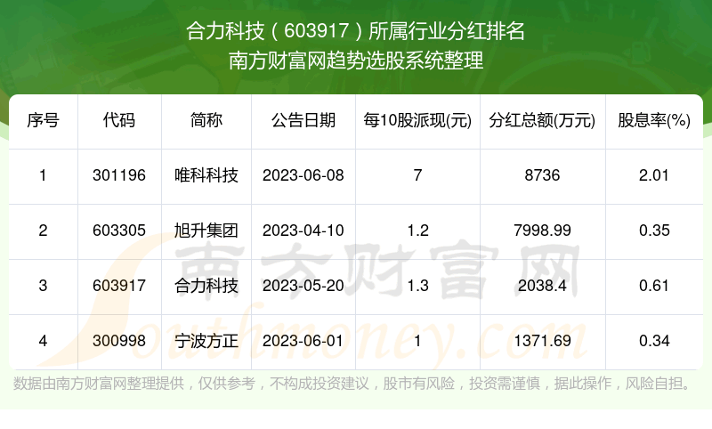 按照趋势选股系统统计,合力科技所属行业为汽车零部件行业,汽车零部件行业分红排名情况如下表: