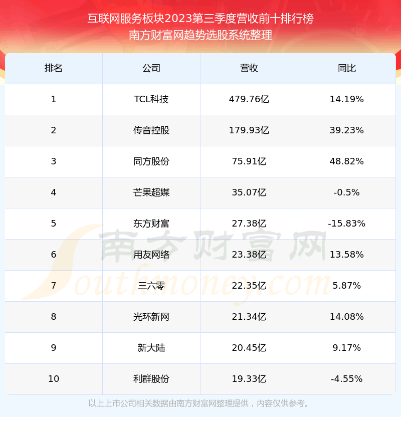 按照趋势选股系统统计,该股所属板块为互联网服务板块,该板块共有50只股票,电科数字2023第三季度营收在该板块中排名为第50名,该板块2023第三季度营收排名前十的股票如下表: