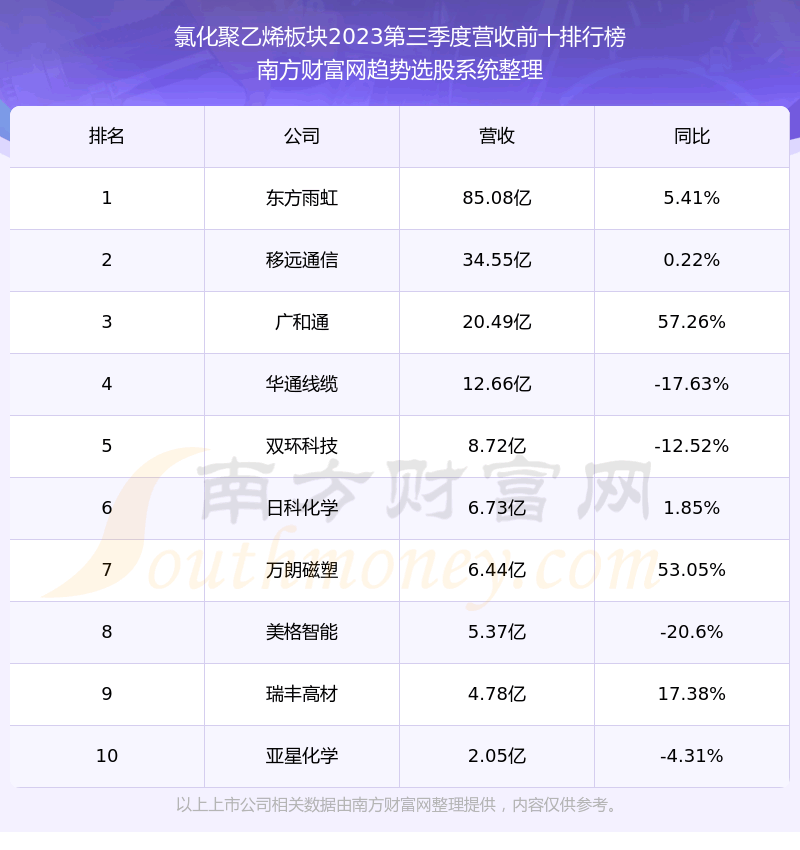 按照趋势选股系统统计,该股所属板块为氯化聚乙烯板块,该板块共有11只股票,亚星化学2023第三季度营收在该板块中排名为第10名,该板块2023第三季度营收排名前十的股票如下表:
