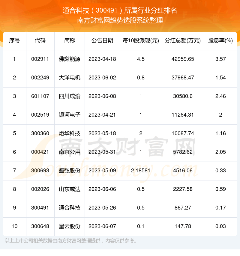 按照趋势选股系统统计,通合科技所属行业为新能源电动汽车行业,新能源电动汽车行业分红排名情况如下表: