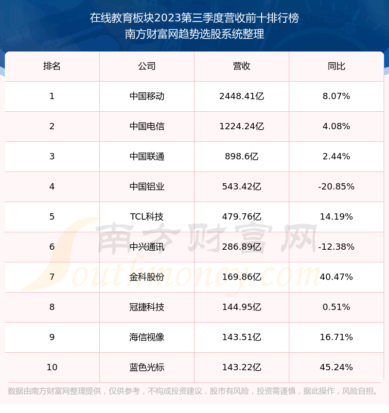 按照趋势选股系统统计,该股所属板块为在线教育板块,该板块共有161只股票,皖新传媒2023第三季度营收在该板块中排名为第20名,该板块2023第三季度营收排名前十的股票如下表: