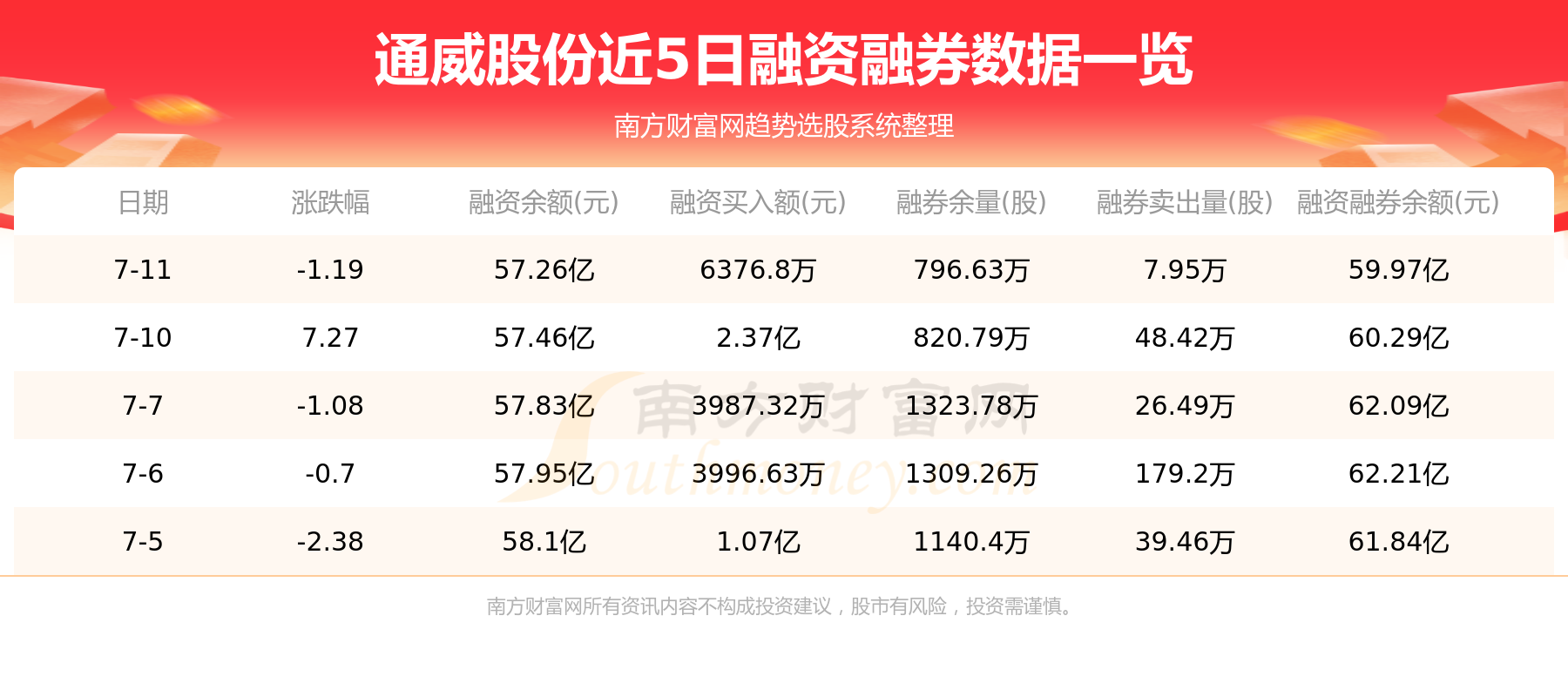 通威股份7月11日融券信息显示,融资方面,当日融资买入6376.8万元,融资偿还8406.61万元,融资净买额-2029.81万元。融券方面,融券卖出7.95万股,融券偿还32.12万股,融券余量796.63万股,融券余额2.72亿元。融资融券余额59.97亿元。近5日融资融券数据一览见下表: